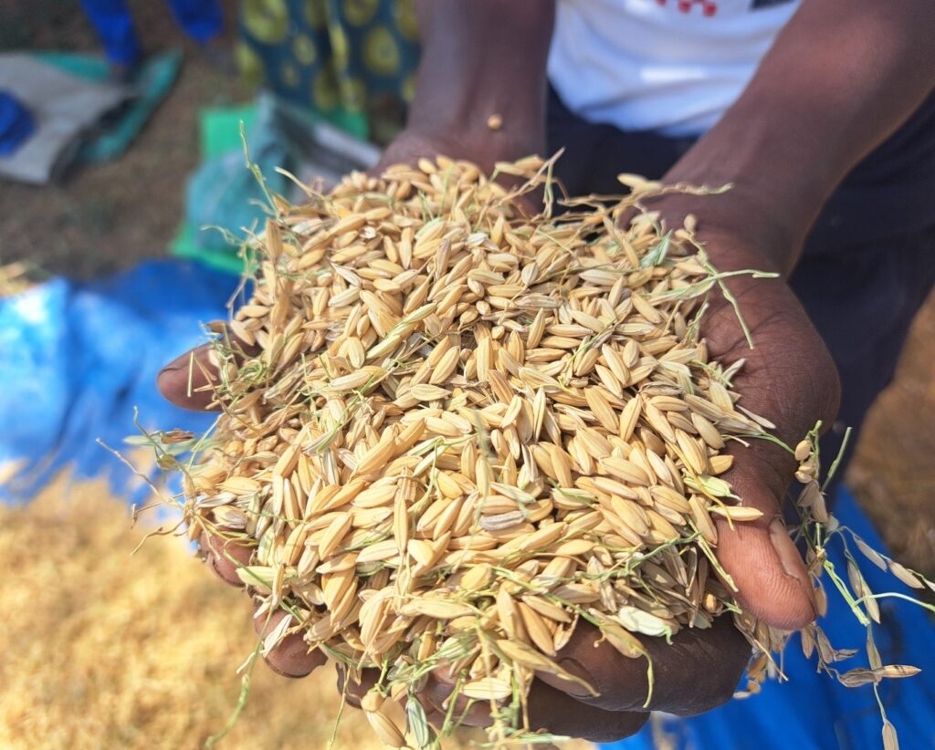 Mr Wellington Makura said, “We are pleased with the programme that we received from SACP and our extension officers, which allowed us to cultivate an alternative cereal crop. We planted Nerica 7 variety which has high yield potential. We planted our rice on the 25th of November 2024. Our rice germinated on the 3rd of December and we harvested our rice in April. Our yield was 262 kgs. Our trainers said 1kg of seed should give us 50kg yield so this was a successful demo for us.